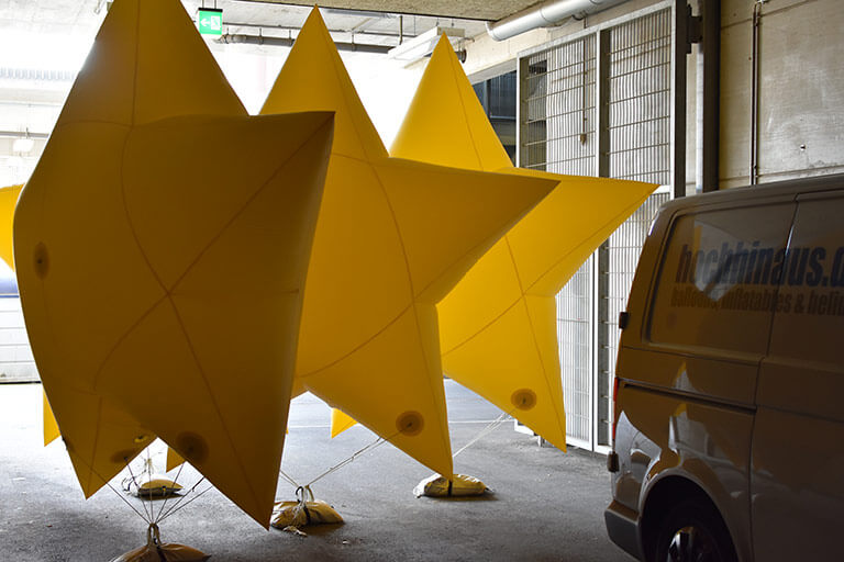 Die Sterne haben eine Höhe von ca. 3,00 Meter und verfügen nur über einen sehr geringen Auftrieb von ca. 400g. Die aufblasbaren Körper bewegen sich leicht im Wind und werden mit einem Halteseil an den Tänzern befestigt.