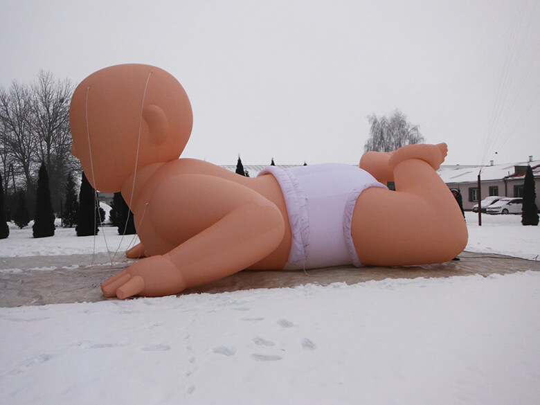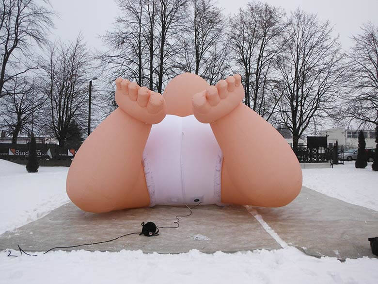 Für einen unserer Agentur-Kunden haben wir dieses aufblasbare Baby gefertigt. Es ist ca. 9,00 Meter lang, ca. 7,00 Meter breit und 5,50 Meter hoch. Die Oberfläche wurde komplett digital bedruckt um einen realistischen Hautton zu simulieren.
