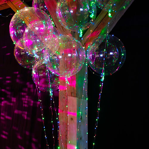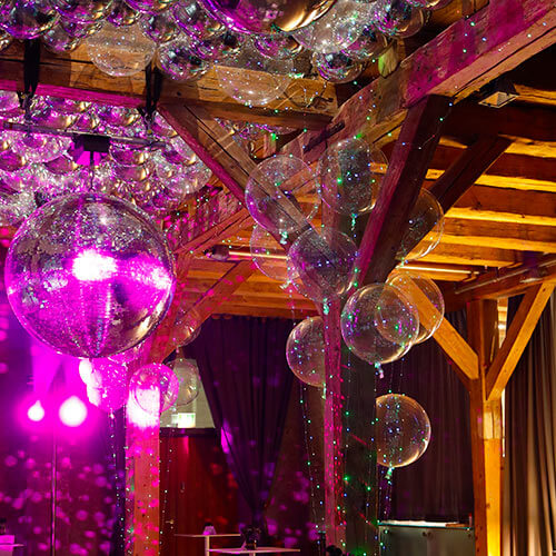 Für eine Abendveranstaltung eines unserer Kunden haben wir eine alte Tenne mit Ballons gestaltet. Die Decke wurde komplett mit unterschiedlich großen Mirror-Folienballons und transparenten LED-Ballons gefüllt. In Kombination mit einer riesigen Diskokugel und einer indirekten Beleuchtung sah das wirklich extrem gut aus! Den Gästen und dem Kunden hat es gefallen!