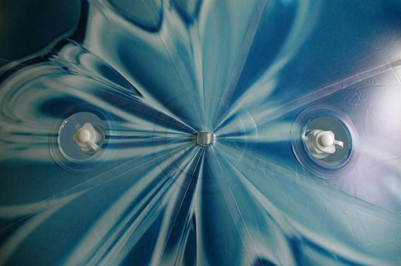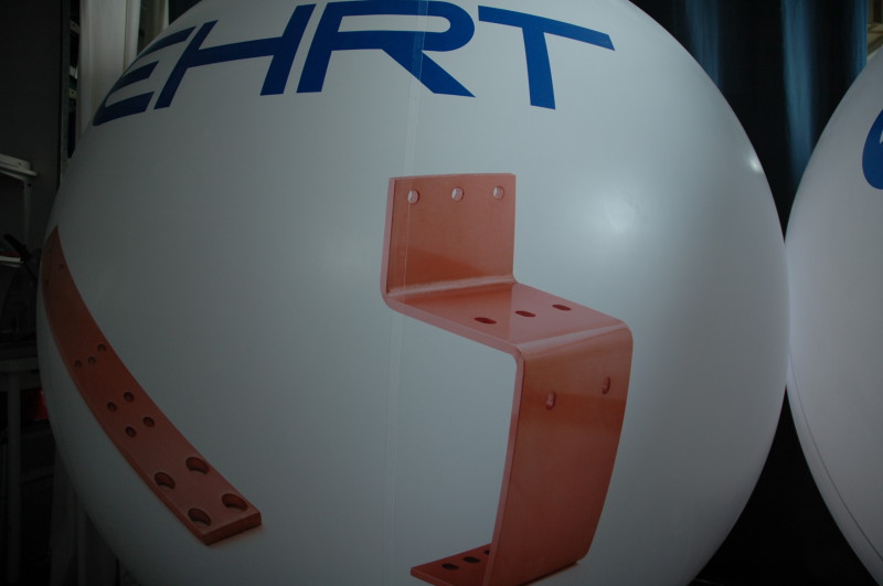 Im Vergleich zu Fesselballons für den Outdoor-Gebrauch benötigen wir bei unseren Messeballons (A) nur eine sehr reduzierte, aber dennoch äußerst stabile Befestigungstechnik. Um den Werbeballon während der Messe durchgehend am Boden zu halten, reicht uns eine einzige Befestigungsöse (B). Wir haben für unsere Messeballons ein eigenes, sehr hochwertiges Befestigungs-Kit entwickelt. Es besteht aus einem Aluminiumflansch (B) direkt am Ballon, einem 5,00 Meter langen, aber unauffälligen, Stahlseil (C) und einem Edelstahlgewicht (D), welches den Ballon am Boden fixiert. Über einen kleinen Stellring kann die Höhe des Ballons reguliert werden.