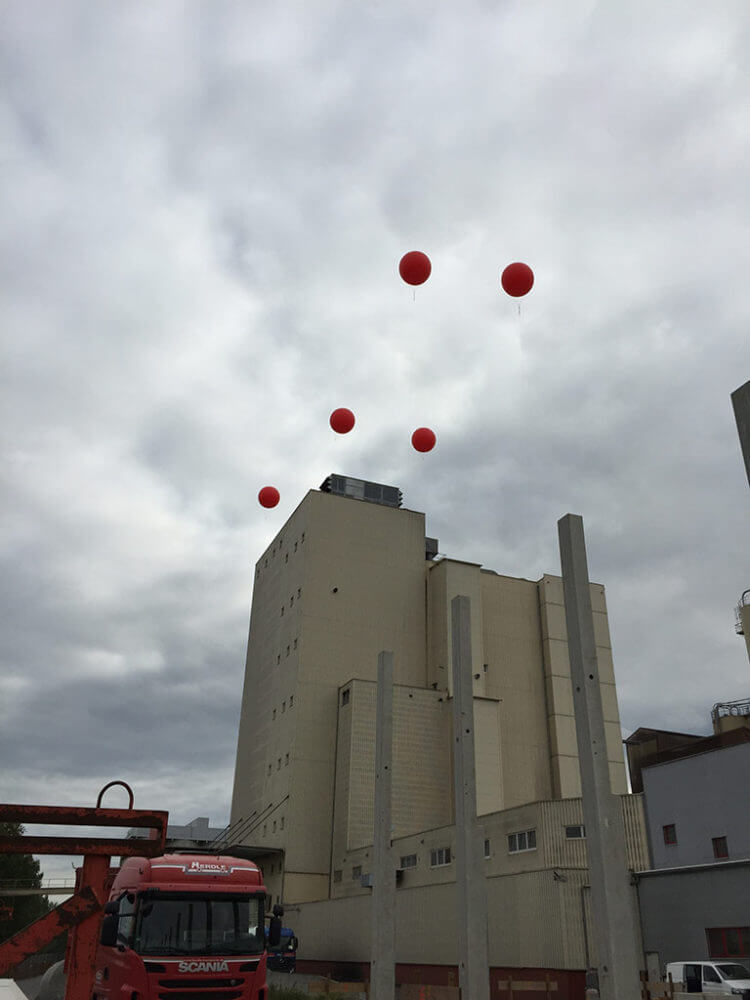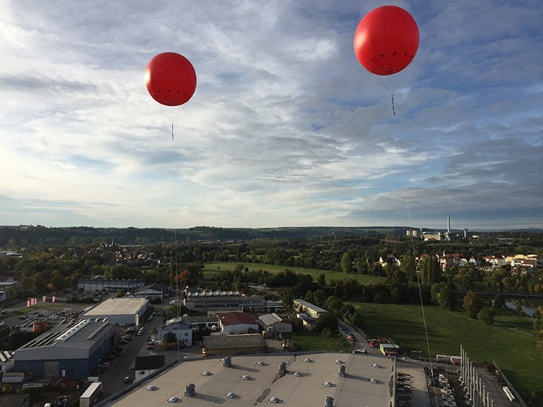 Ballone werden verwendet, um Höhenmessungen und Silhouetten-Darstellungen durchzuführen. Für Thyssenkrupp haben wir z.B. einen 4,00 Meter Fesselballon in Rottweil für einen geplanten Neubau eines Fahrstuhl-Testturmes auf eine Höhe von 240 Meter aufgelassen, um die Spitze des Bauvorhabens zu visualisieren.