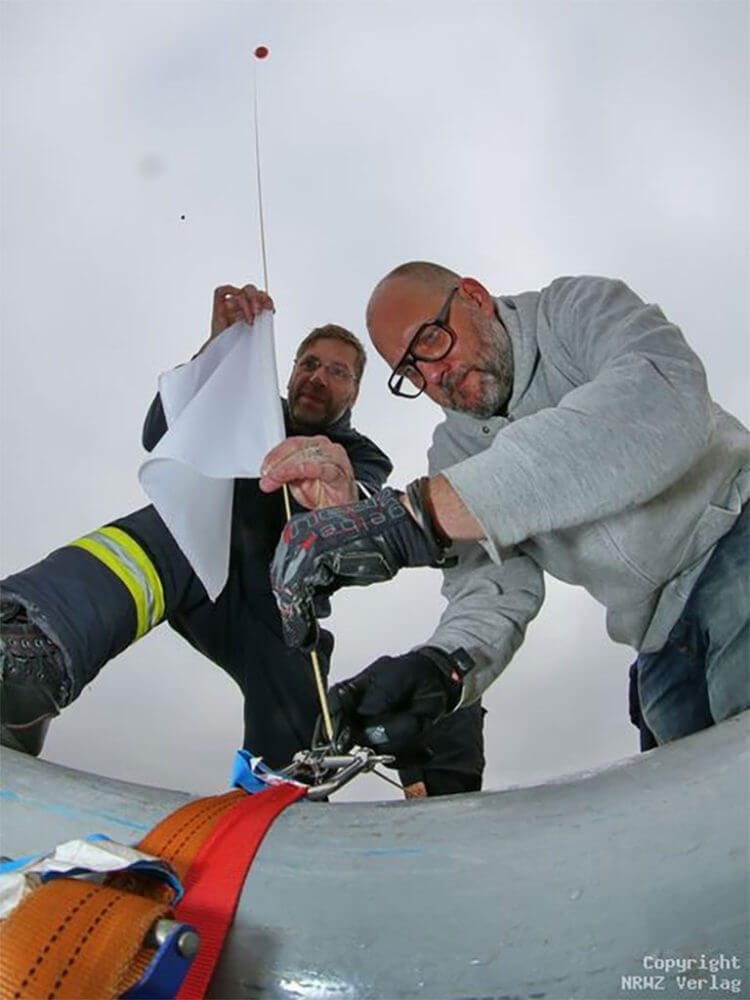 Silhouetten-Darstellung mit einem 4,00 Meter Fesselballon für den geplanten Neubau eines 245 Meter hohen Fahrstuhltestturmes in Rottweil. Mit der örtlichen Feuerwehr stimmen wir den Aufbau ab und sperren das Gelände rund um den Einsatzort.