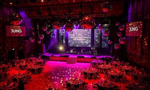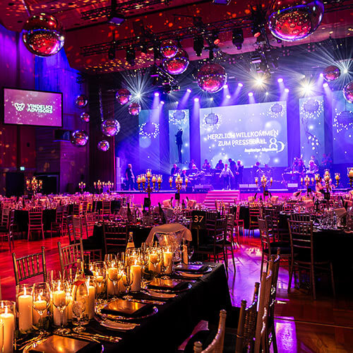 Für den Augsburger Presseball durften wir den Ballsaal und das Foyer mit einer eleganten Spiegelkugel-Installation ausstatten.