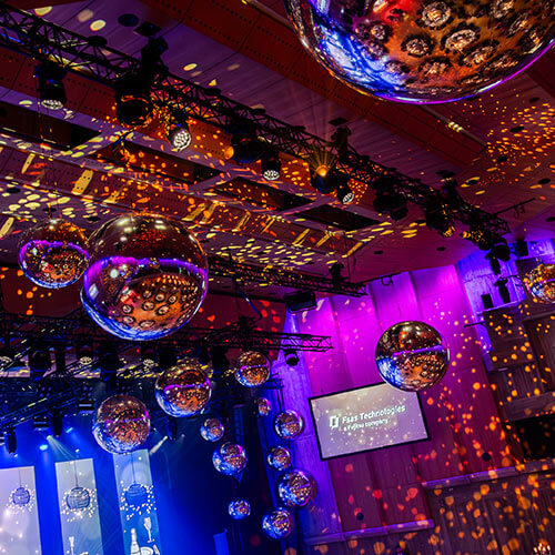 Auch im Foyer, rund um die Bühne, kamen mehrere Spiegelkugeln in verschiedenen Größen zum Einsatz. Dadurch entstand ein stimmiges Gesamtbild, das die Gäste bereits beim Eintreten empfing und sich durch die gesamte Location zog.